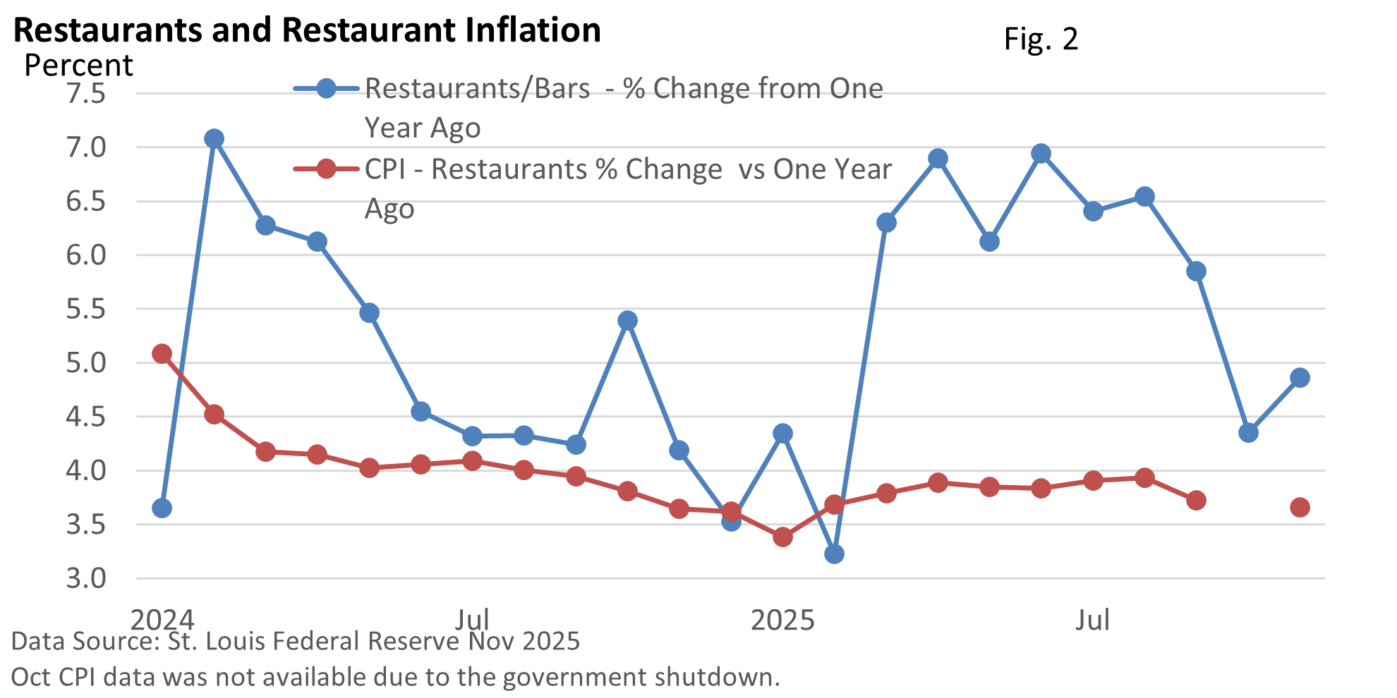 Figure 2 attempts to adjust for inflation by comparing the annual change in sales at restaurants with the annual change in the CPI for eating out. Given that adjustment, sales are outpacing inflation in all but two months.
