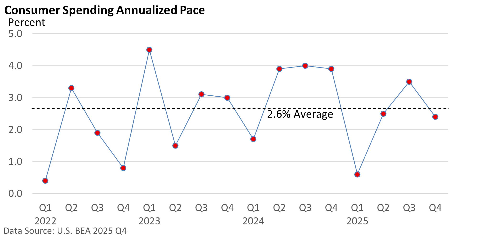 Consumer spending rose at an annualized rate of 2.4% in Q4 and is near the four-year average of 2.6%, according to US BEA data. In addition, business spending and investment continue to rise, partly driven by massive outlays for AI data centers.
