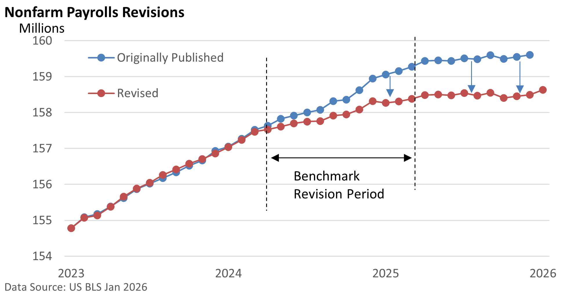 What does this look like graphically? The economy created fewer jobs than initially reported.